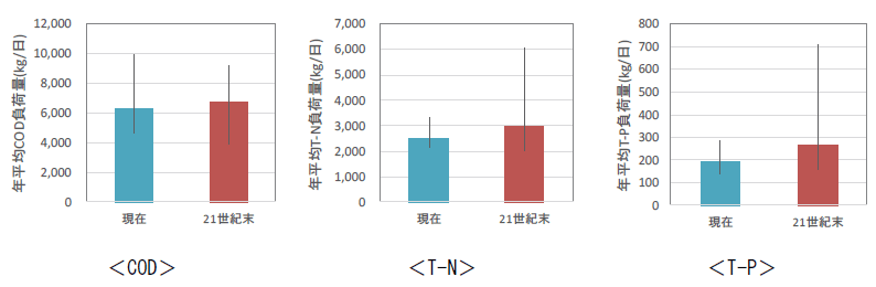 ※既往実測データを用いた検証を行ったモデルを用いており、流量が大きくなると水質濃度が高くなり、それに伴い負荷量が指数関数的に増加する。ただし、気候シナリオの将来(21世紀末)で生じている大きな流量は検証範囲の外挿となっており、予測結果の負荷量増には不確実性が含まれることに留意が必要である。