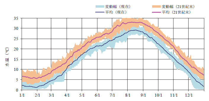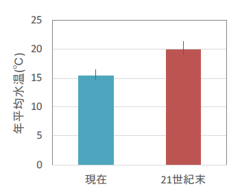 印旛沼の年平均水温は、将来(21世紀末,RCP8.5)、現在と比べ約4.5℃上昇すると予測された。季別には、年間を通じて、平均的に水温は上昇するとの予測結果となっている。