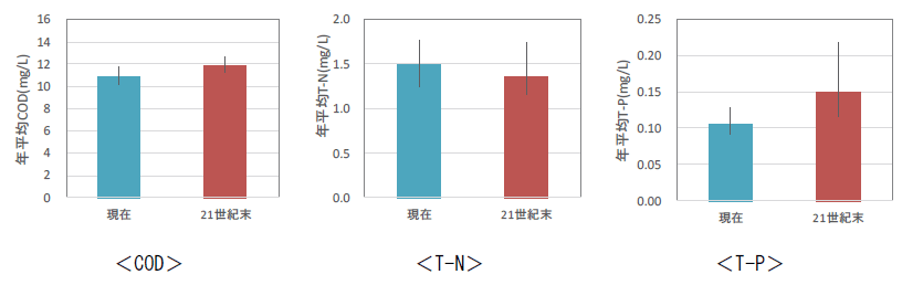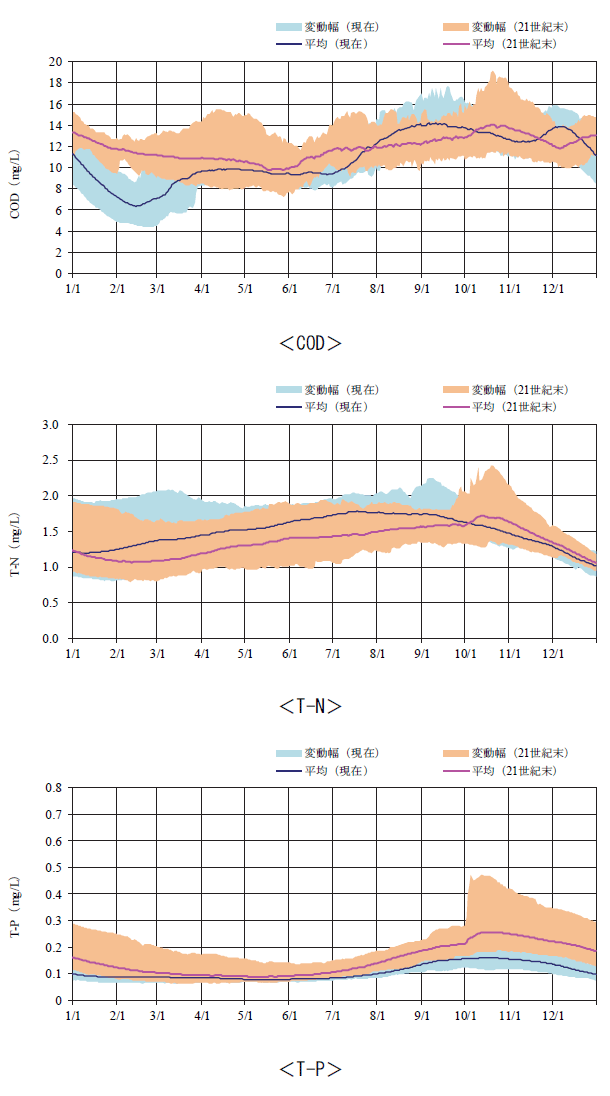印旛沼の年平均CODは、将来(21世紀末,RCP8.5)、現在と比べ約1.0mg/L増加すると予測された。現在は冬季に濃度が低下するが、将来は年間通じて高い濃度を維持する傾向となっている。