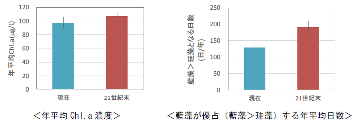 印旛沼の年平均Chl.aは、将来(21世紀末,RCP8.5)、現在と比べ約10μg/L増加すると予測された。