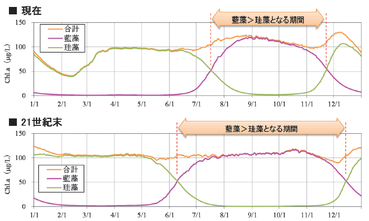 印旛沼の水質で問題となっている事象の一つに、夏場のアオコの発生が挙げられるが、水温の上昇に伴い、アオコの原因となる藍藻類の優占期間が将来、現在と比べ約2ヶ月長期化する結果となっており、アオコ発生期間が長期化するリスクがある。