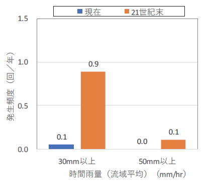 降雨強度の強い雨が発生する頻度が将来(21世紀末,RCP8.5)は増加すると予測されており、印旛沼流域で流域平均雨量が50mm/hrを上回る降雨は、現在は発生しない状況(0回/年)であるが、将来は0.1回/年(10年に1回程度)に増加する予測結果となっている。