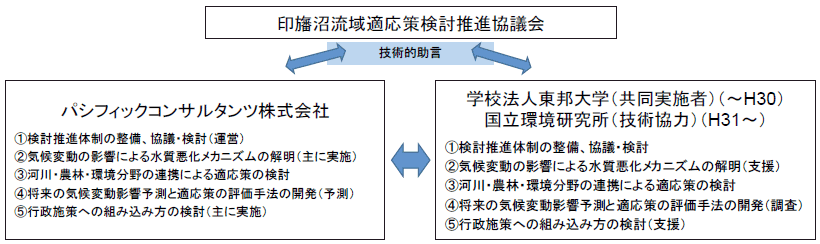 検討にあたり、気候変動による印旛沼への影響評価・適応策検討に係る事項についての技術的助言を得るため、学識者・行政関係者からなる「印旛沼流域適応策検討推進協議会」を設置し、年2回開催した。(詳細は、後述3.3.3参照)