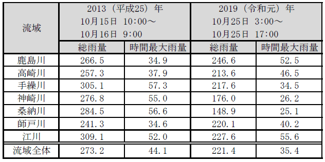 それぞれの洪水における降雨の状況は表3-2に示すとおりであり、既往洪水実績から見て、流域平均雨量が50mm/hrを上回る降雨というのは、印旛沼流域において被害が発生するリスクが高い雨量規模といえる。