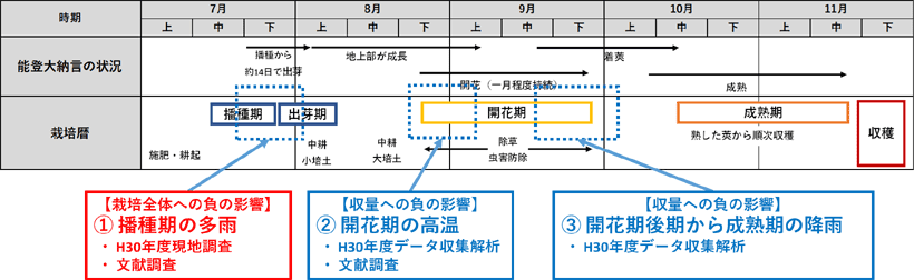 文献調査とヒアリング調査、既存データの収集解析、及び圃場での栽培試験によって能登大納言小豆の生育に影響する気象条件との関係は、播種期(標準播きでは7月下旬)の多雨による畑の泥濘化、出芽及び根の成長阻害等、開花期(同、8月下旬から9月上旬)の高温による収量減少、及び開花期後期から成熟期(同、9月頃)の降雨に起因する登熟不良等であることがわかった(図6-3)。