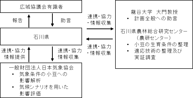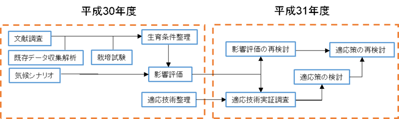 本調査では、平成30年度から平成31年度の2年間で、能登大納言小豆の生育へ影響する気象要因を調査し、将来の影響評価及び適応策の有効性の確認を行った(図6-2)。
