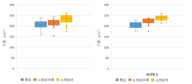 将来の収量予測(RCP8.5 左:MRI-CGCM3、右:MIROC5)
