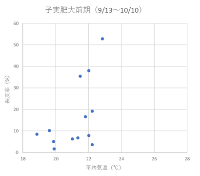 子実肥大期(9/13~10/10)の平均気温と黒大豆の不定形裂皮率