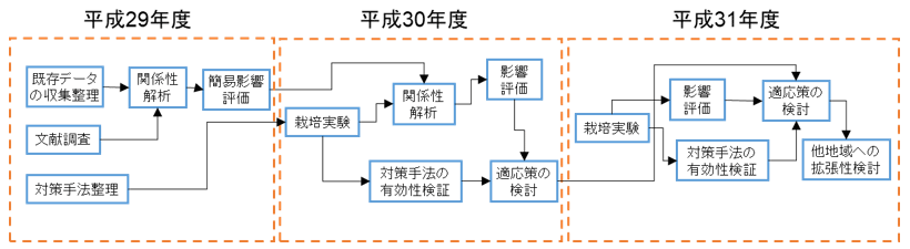 本調査では、平成29年度から平成31年度の3年間で、対象地域における影響を調査し、将来の影響評価及び適応策の検討を行った(図3.1-2)。初年度の平成29年度は関係するデータ・文献等の収集整理、及び簡易的な影響の評価を行った。平成30年度には、更に収量を中心にデータ解析を進めると共に、適応策となり得る栽培方法に関する実験を開始した。平成31年度は収量及び品質に関する将来影響を検討した他、栽培実験を行い、効果的な適応策について検討した。