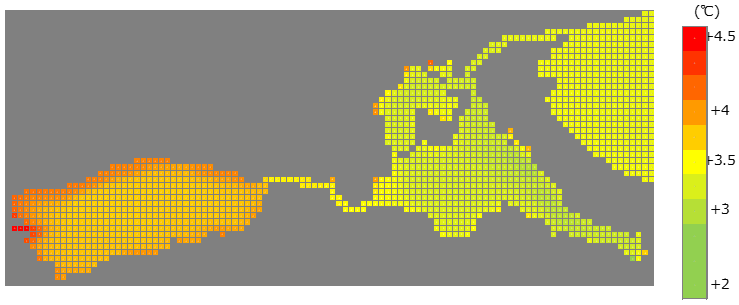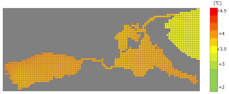 現在と21 世紀末(RCP8.5)の表層水温の差(℃)(MRI-NHRCM02)