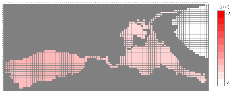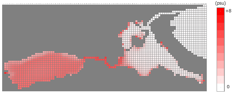 現在と21世紀末(RCP8.5)の底層塩分の差(PSU)(MRI-NHRCM02)