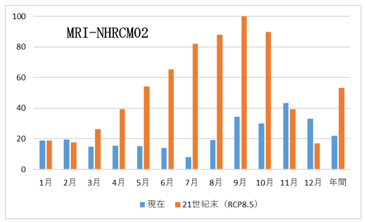 現在に比べ、21世紀末は塩分躍層が発生している時間が長くなり、発生のピークが9月であり、現在よりも2ヶ月ほど早まると予測された(RCP8.5)。