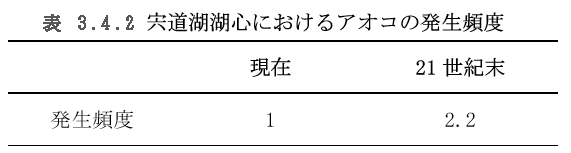 宍道湖におけるアオコの発生予測式を用いて、現在と21世紀末のアオコの発生有無を1日単位で予測し、その頻度を比較したところ、21世紀末は、現在よりも約2.2倍発生頻度が高まると予測された。