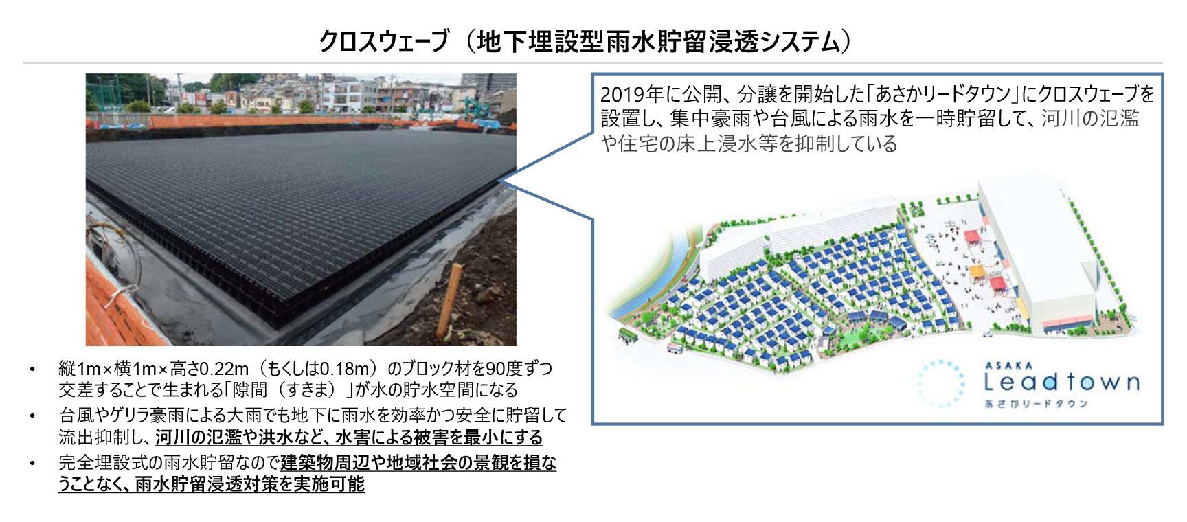 (出典:積水化学工業株式会社「積水化学の雨水対策製品のご紹介」及び、セキスイハイム工業株式会社HP「朝霞あさか市と積水化学グループがつくるSDGsへの貢献に取り組む複合大規模タウン」より作成)