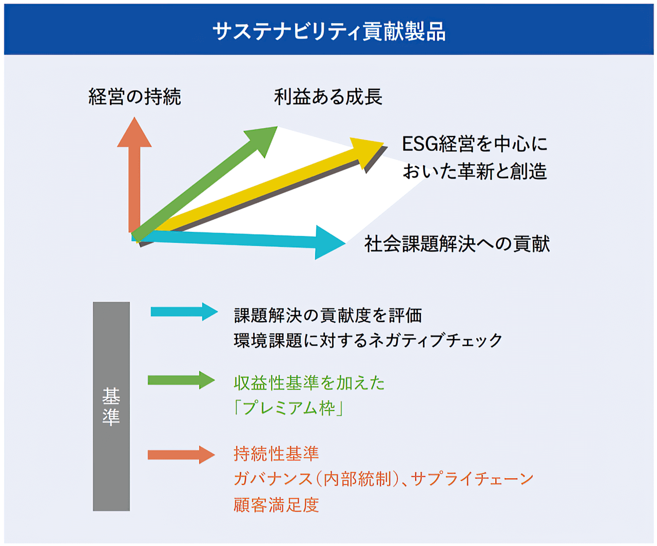 環境課題解決のトレードオフについては、「サステナビリティ貢献製品」という、気候変動適応などの環境課題も含む、社会課題解決に対して貢献度が高い製品を登録する制度の運用を通して考慮します。