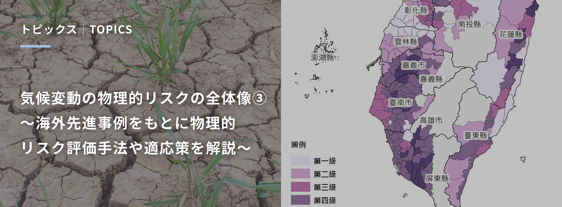 これまでの記事「気候変動の物理的リスクの全体像② ~暑熱・原材料調達・水ストレスの3分野の事例をもとに解説~」では、国内の先進事例をもとに企業の分析ニーズが高い3つの分野(水ストレス、原材料調達、暑熱)の具体的な評価手法を解説しました。