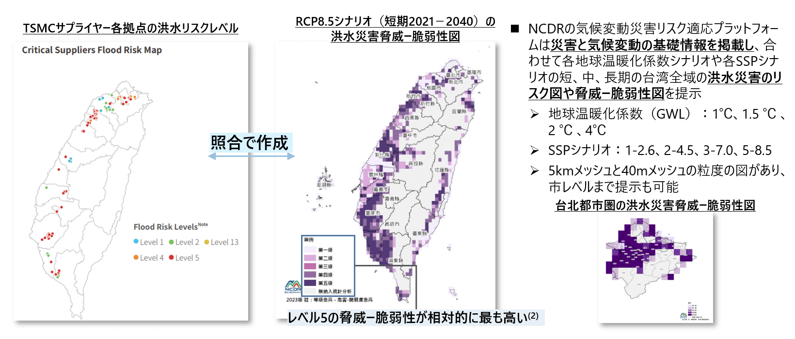 - 洪水リスク評価の過程では、国家災害防止科学技術センター(NCDR)が発行したRCP8.5シナリオに基づく台湾の洪水災害脅威・脆弱性図を活用し、重要なサプライヤー拠点における洪水リスクレベルを評価