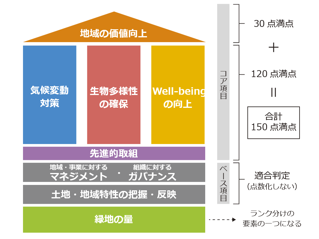 「気候変動対策」、「生物多様性の確保」、「Well-beingの向上」及びこれらを通じて期待される「地域の価値向上」の観点から「質」を点数化し、「緑地の量」を加味して評価する。