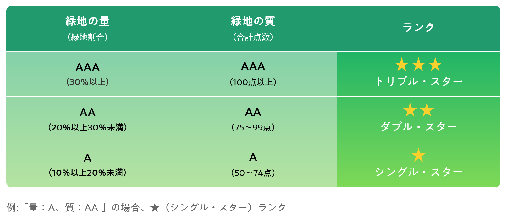 認定されたものは、緑地の質・量の両方の評価レベルに応じて3段階でランクが付与される。