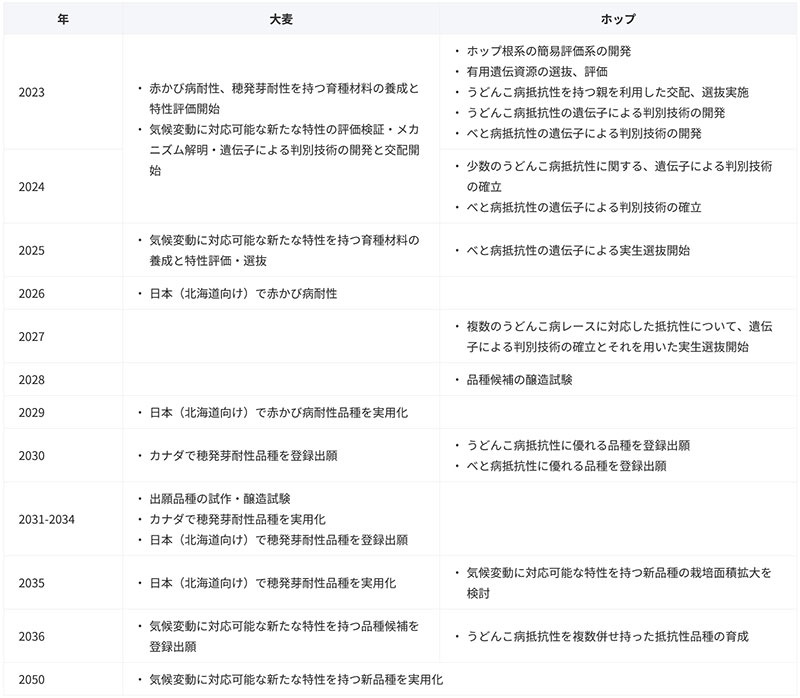 - 2030年までに気候変動に適応するための新品種(大麦、ホップ)を登録出願
