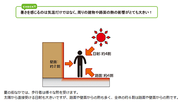 - 適応策:環境省が提供している情報からもわかるとおり、夏の暑さを感じる元は直射日射もさることながら、蓄熱された壁面や地面からの輻射熱も多いことが知られている。(下図参照)