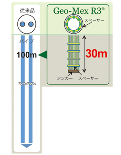 従来の地中熱交換機は100m程度の掘さくが必要であったが、三井化学産資の地中熱交換器「Geo-Mex R3®」は30mの浅埋での施工が可能である(図1)。 30mの浅埋での施工を実現させることにより、従来の井戸掘さく用機械での掘さくを可能とし、施工期間の短縮、掘さく費用の低減に貢献する(図2)。