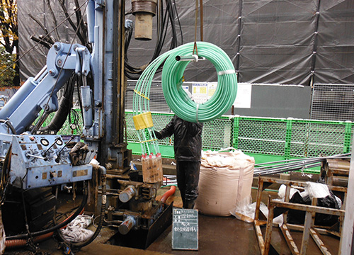 「地中熱交換器」は、地中熱ヒートポンプ(注1)で冷暖房に必要な熱源を地中から採取するものである。空気熱源ヒートポンプ(注2)から地中熱ヒートポンプに置き換えることにより、温排気の大気中への放出が無くなるため、ヒートアイランド現象の軽減にも繋がる。地中の深さ10m以深の温度は、季節によらず安定しており、夏は外気温より冷たく、冬は外気温より暖かい性質を有している。このため、そのエネルギー(温度差)を利用し、冷暖房時の電力使用増加を防ぐ。