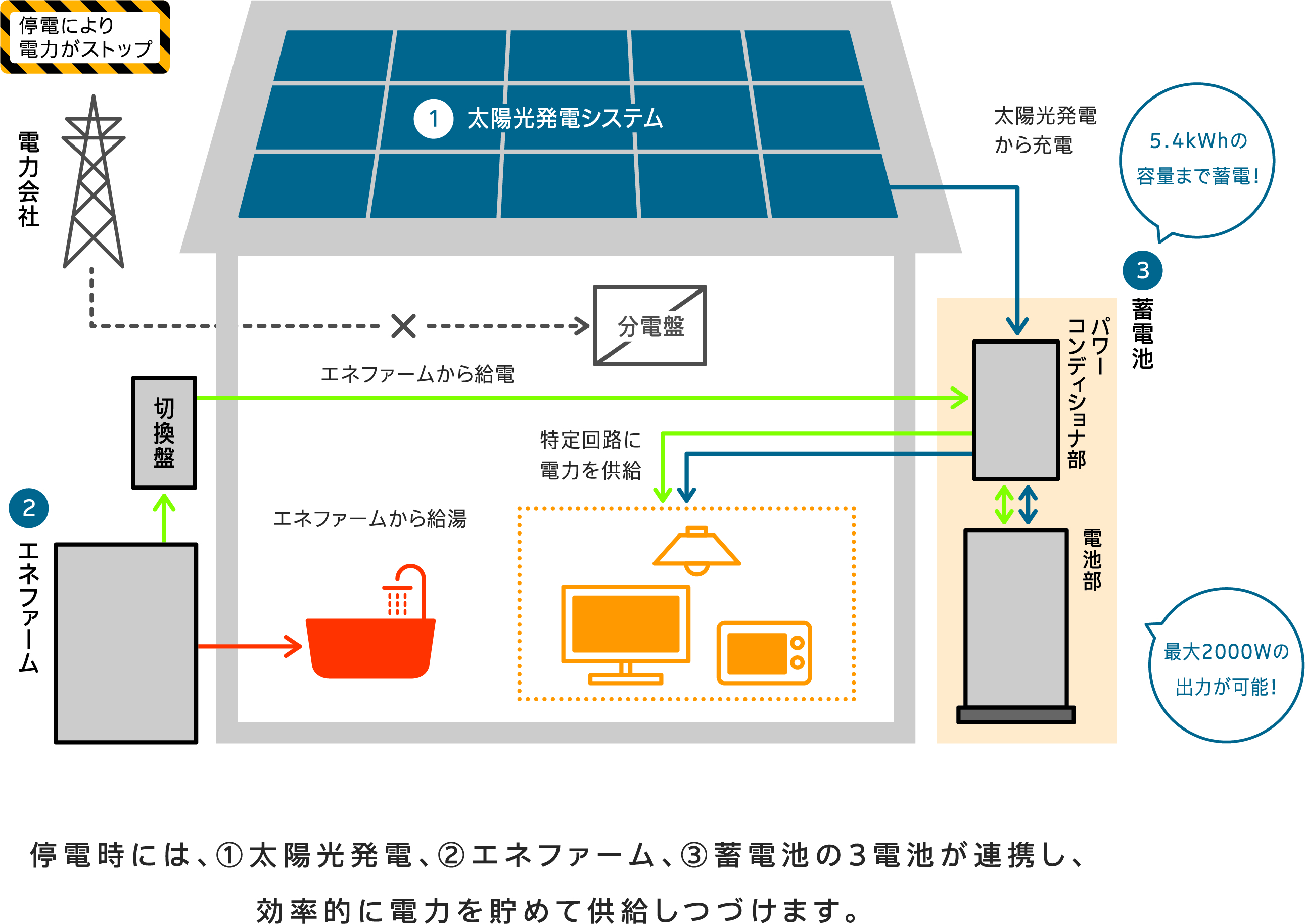 太陽光発電システムとエネファーム、家庭用リチウムイオン蓄電池を連携させて効率的に電力を貯めて供給し続ける「全天候型3電池連携システム」により、テレビで災害情報を得られる、被災時も温かいシャワーが使える、冷蔵庫などの消費電力の高い家電も利用できる、といった停電時でも「電気がずっと使える」という安心を得ることができる。また、瓦やガラスの強化によって、飛来物による被害が少なくなることも期待される。