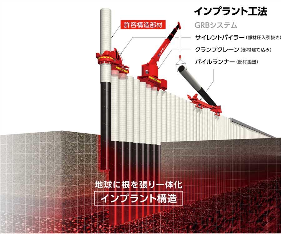 鋼管杭を地中深くに押し込むインプラント工法で、強靭な連続壁「インプラントウォール」を築造する。各杭は地盤に支えられるため、地震動や土石流といった外力を受けても粘り強く耐え留まる。また、全ての機械装置が既設杭上で稼働する「GRBシステム」により、災害発生箇所や法面、狭隘地でも施工が可能である(図1)。工事の影響範囲が機械幅に限定されるため、建設現場周辺の鉄道・道路の交通を妨げることなく施工できる。