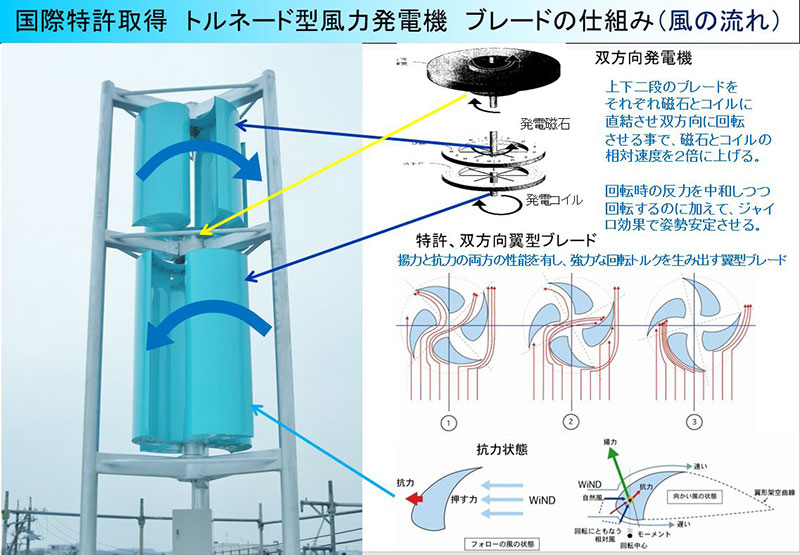 従来の風力発電機は、強風域での発電が安定して行えず、電力供給が不安定であった。当社のトルネード型風力発電機は、頑強な三角フレーム構造により、強風時の支柱が折れるなどの破損が無く、ブレード(羽根)も風に強い構造になっている(図1)。また双方向に回転するブレードによって得られるジャイロ効果で、回転数が上がるほど筐体の安定が増す構造になっている。このように、機械力に頼るのではなく、自然の法則により制御しているため、自然力に対して非常に堅牢な特徴を持っている。