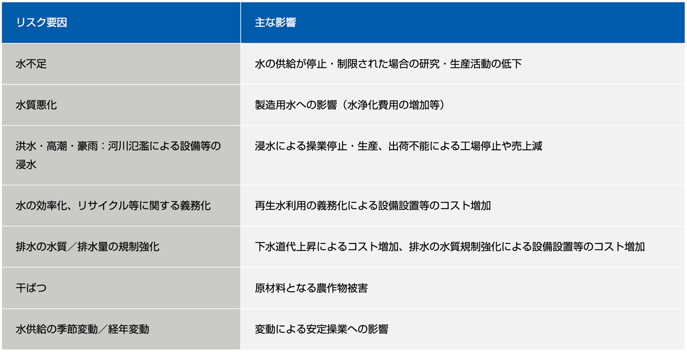 気候変動による影響には、温室効果ガス削減の国際的枠組みに基づいたCO2排出規制の強化、平均気温の上昇や渇水・洪水などの物理的な影響、疾病構造の変化や健康への影響などが考えられる。第一三共グループが事業を推進・継続するにあたり、十分な量の良質な淡水がすべての事業所およびバリューチェーンにおいて利用可能であることは、非常に重要であると考えている。