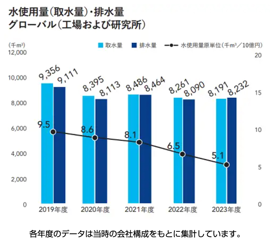 水資源の適正利用によって、2023年度におけるグループ全体の水使用量原単位は511㎥/億円 (2020年度比 40.7%減少) となった。また、グループ全体の水使用量は、8,191千㎥と2020年度比で2.4%減少した(図3)。
