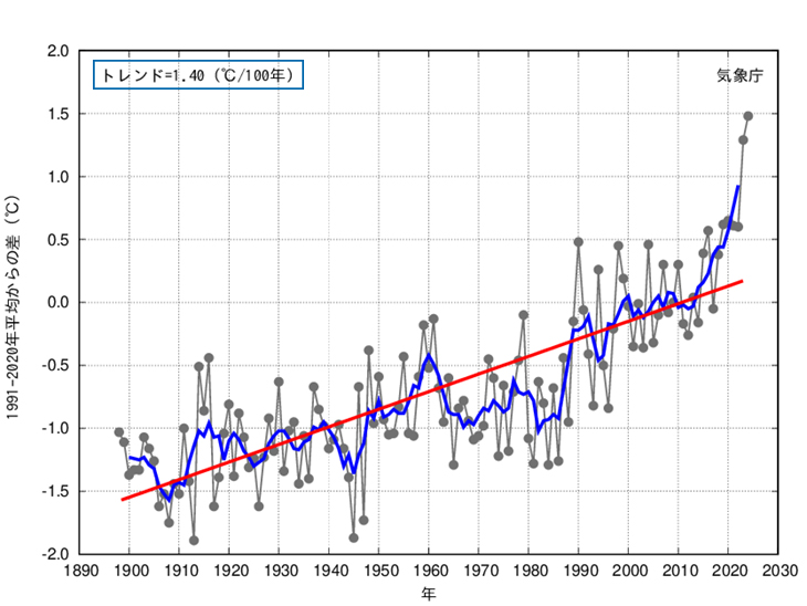 直線(赤):長期変化傾向。基準値は1991〜2020年の30年平均値。