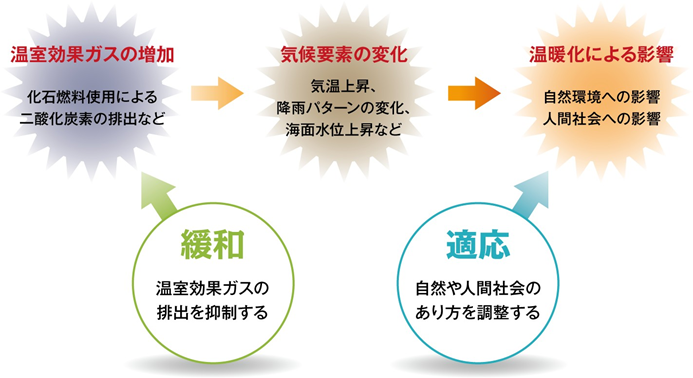 • 気候変動対策には、二酸化炭素等の温室効果ガスの排出を削減する「緩和」と影響への対応としての「適応」どちらも重要です。