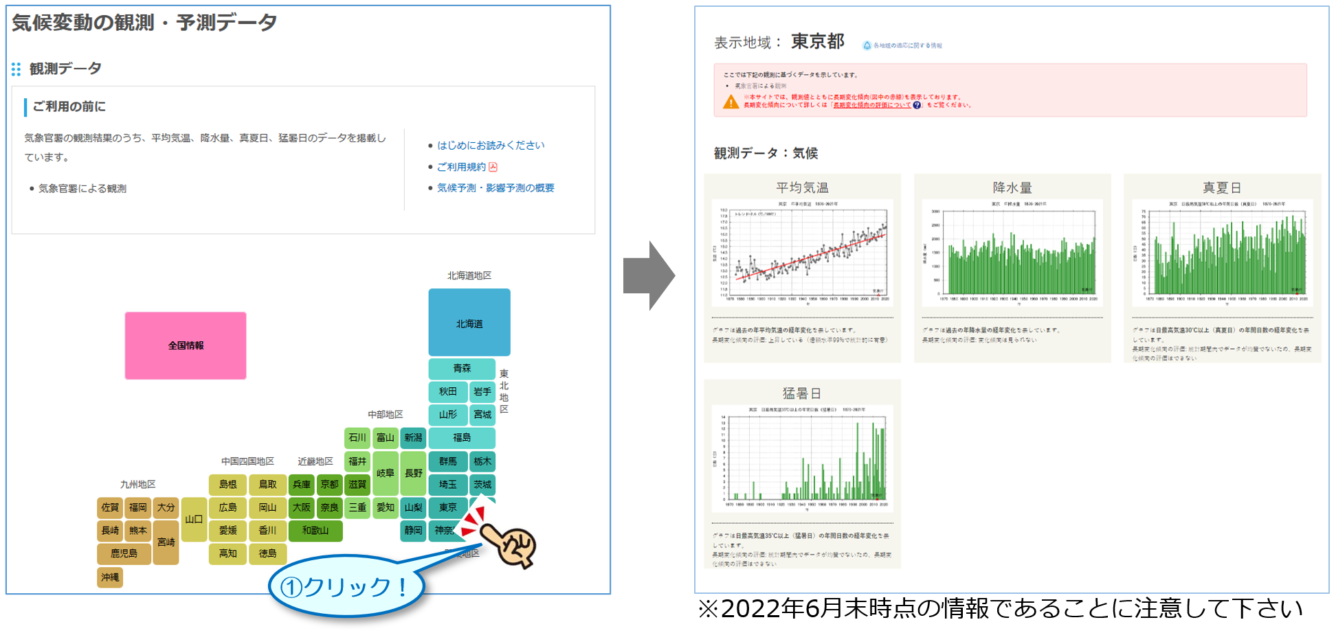 都道府県ごとのこれまでの気候の変化(年平均気温、降水量、真夏日、猛暑日)に関する情報は、例えば、気候変動適応情報プラットフォーム(A-PLAT)から確認でき、この情報は気象庁から提供されています。