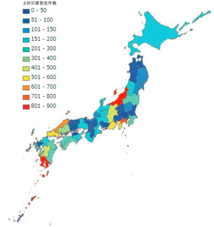 - 全国各地で毎年のように甚大な土砂災害が発生しています。平成18年から平成27年までの過去10年間の土砂災害発生件数をみると、平均して1年間におよそ1000件もの土砂災害が発生しています。下図はこの10年間の都道府県別の発生件数を示したものであり、全ての都道府県で土砂災害が発生しています。また、土砂災害が発生するおそれのある危険箇所は、日本全国で約53万箇所もあります。
