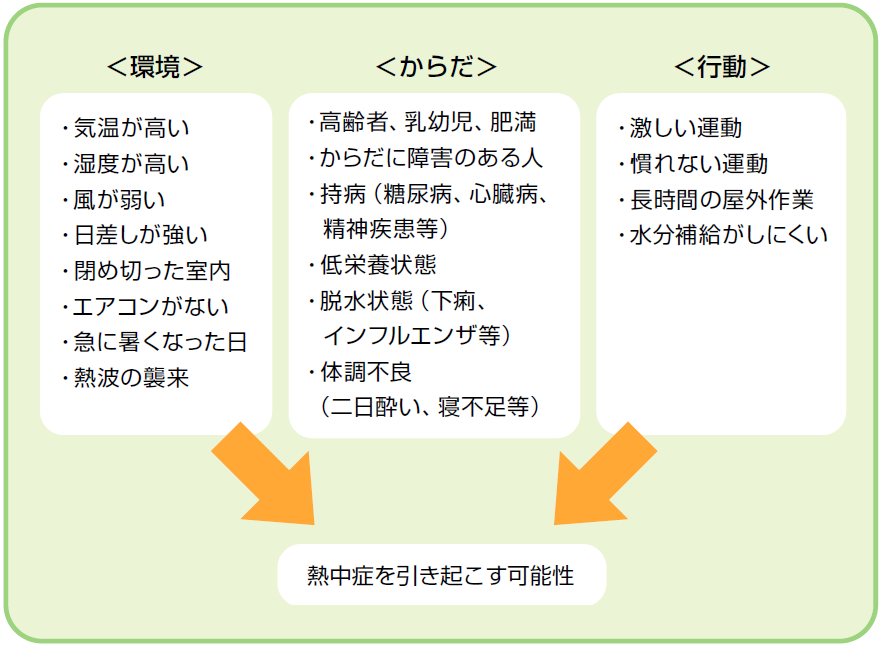 - 熱中症を引き起こす条件として、高い気温や湿度、弱い風、激しい運動や長時間の屋外作業、脱水状態などがあります。