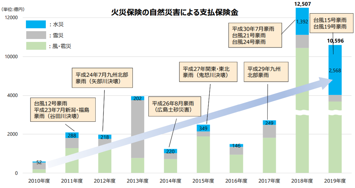 自然災害による保険金支払いは、ここ10年で増加傾向にあります。特に2018・2019年度は風災と水災を中心に大幅に増加し、2年連続で1兆円を超える保険金支払いとなりました。