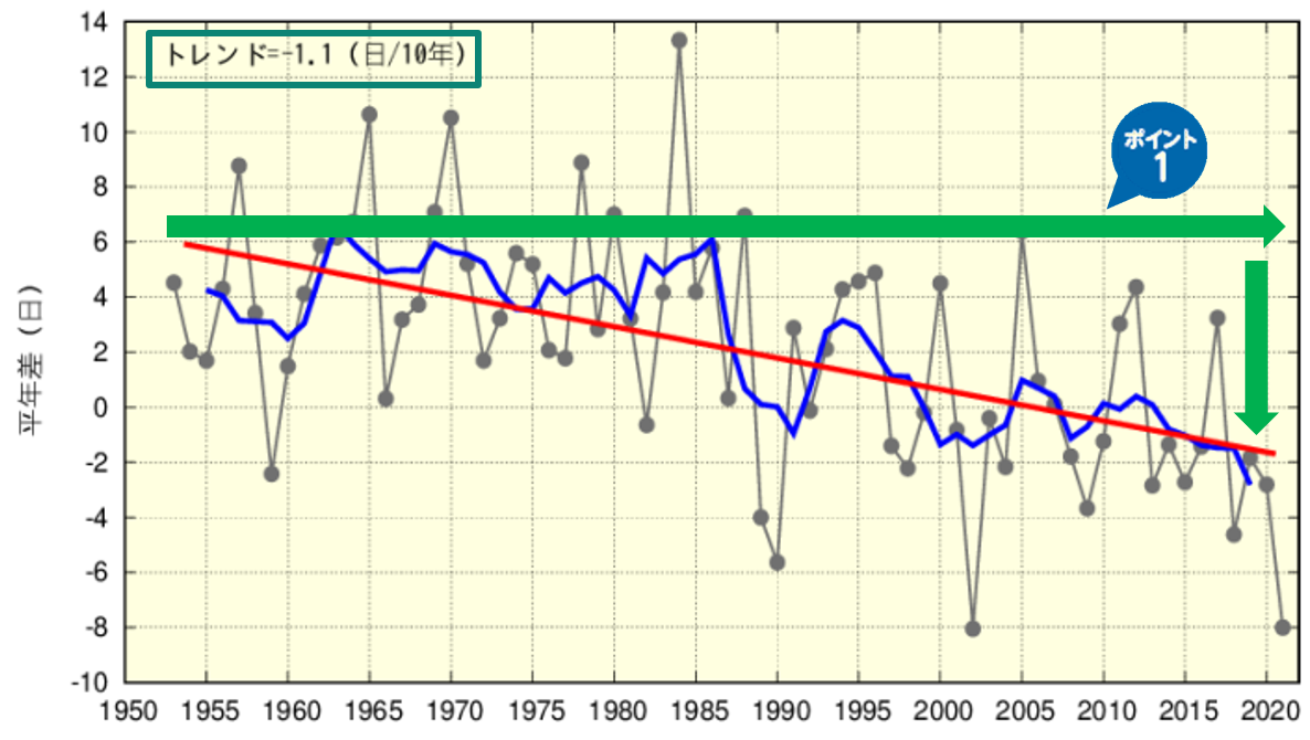 • 1953年以降、サクラの開花日は、10年あたり1.1日の割合で早くなっています(下図ポイント①)。気温上昇が、サクラの開花時期の早まりに影響していると考えられています。