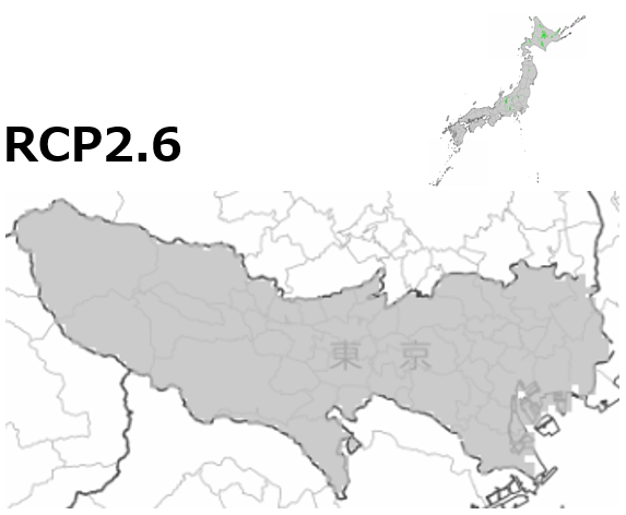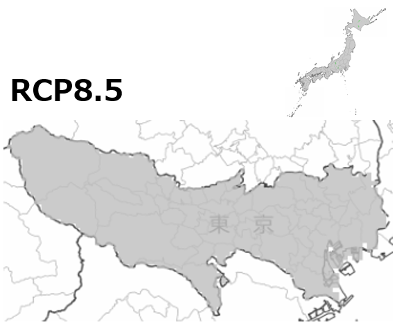 - 左下図は厳しい温暖化対策を取った場合(RCP2.6)、右下図は現状を上回る温暖化対策を取らない場合(RCP8.5)の予測結果です。