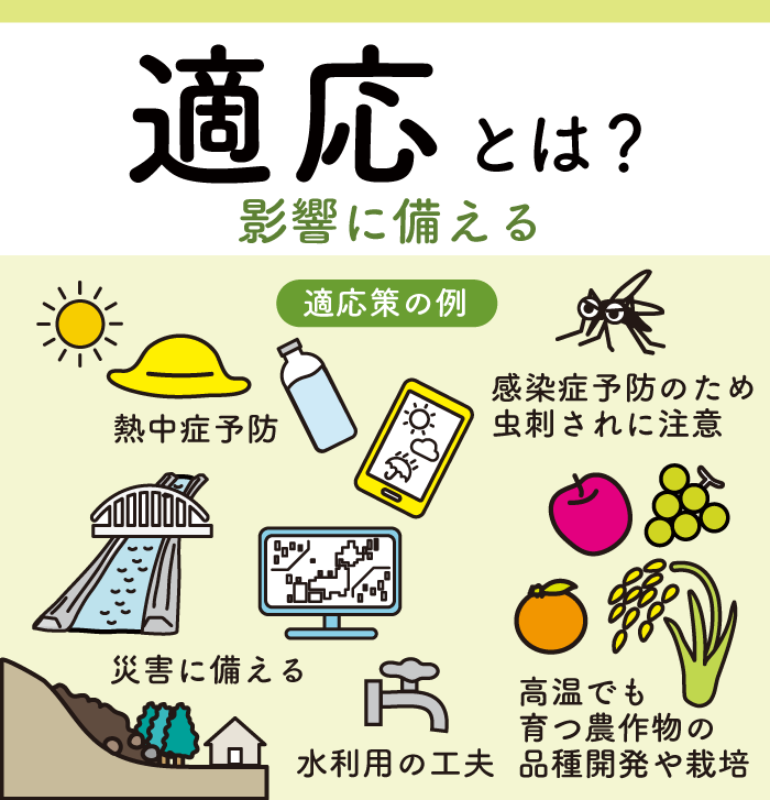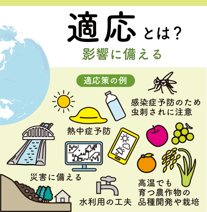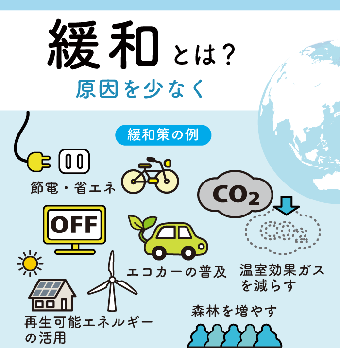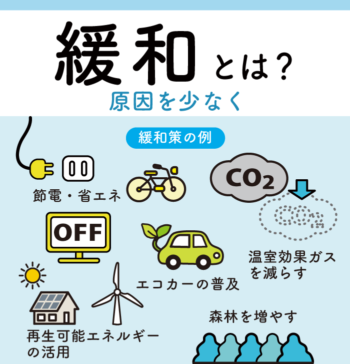 気候変動が起こらないようにする「緩和」と、すでに起こりつつある気候変動の影響への「適応」。気候変動への2つの対策について紹介したイラストです。