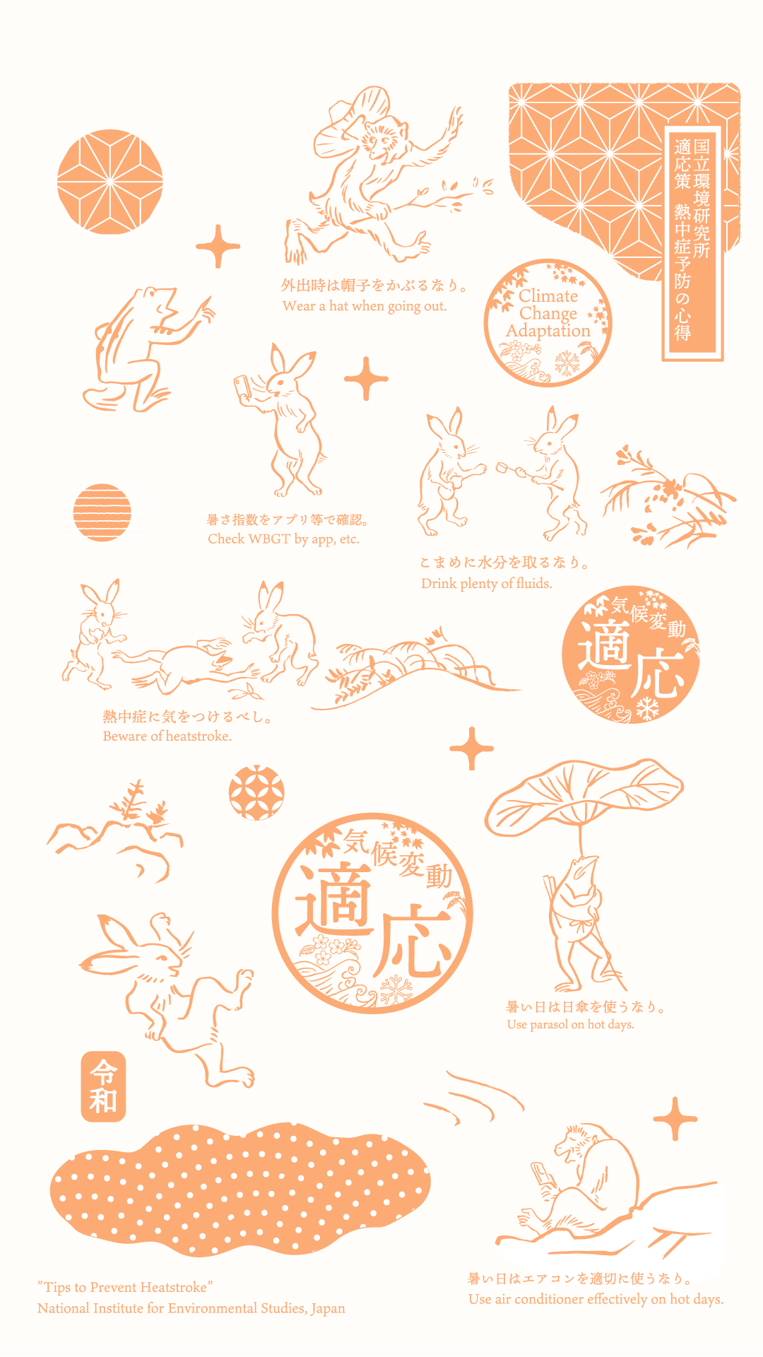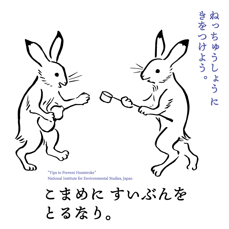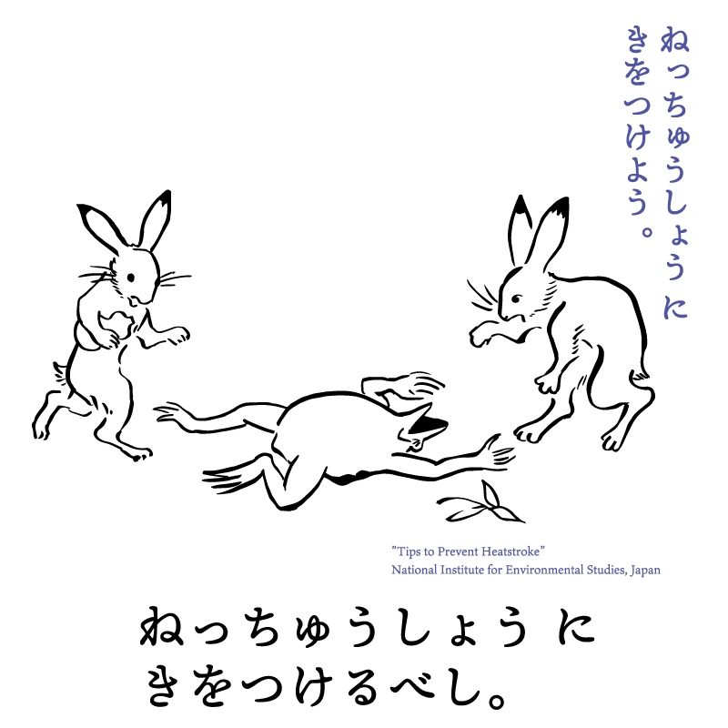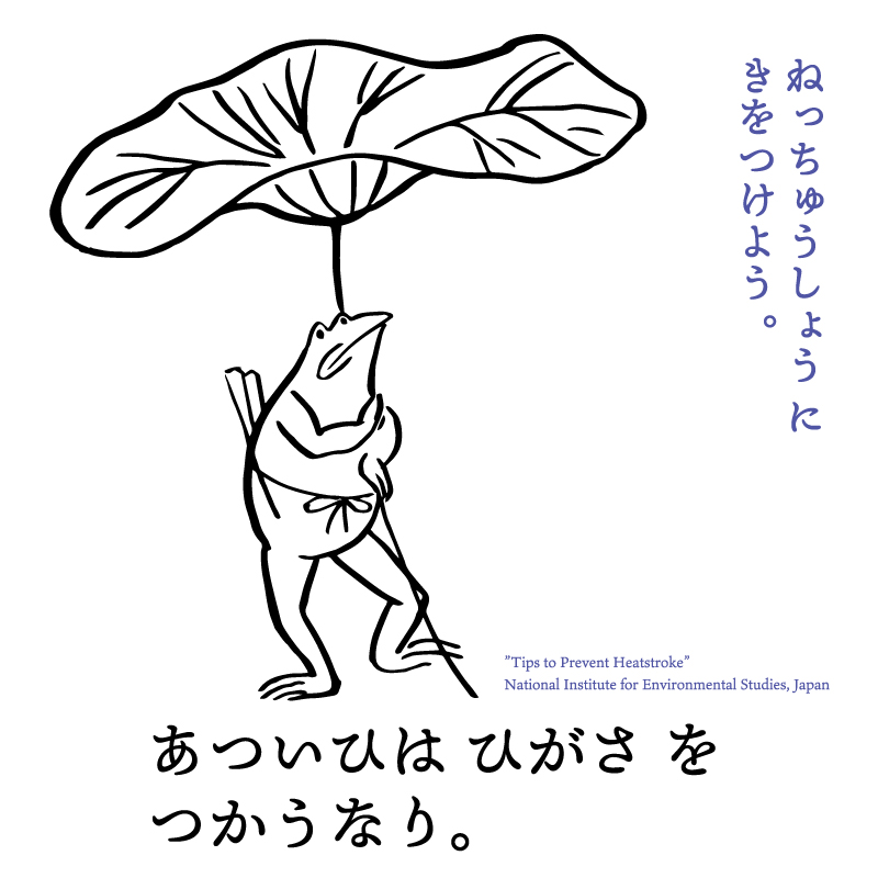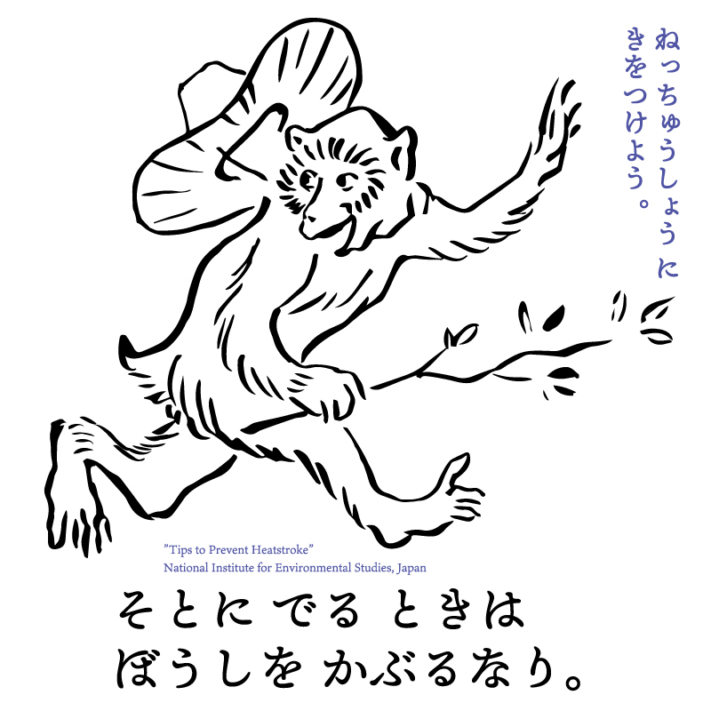 「鳥獣戯画」を手本とした動物たちで綴られた熱中症予防策の心得集。ご家族やご友人へのちょっとしたメッセージや、ご自宅や学校、職場の壁に貼るなど普及啓発にご利用ください。